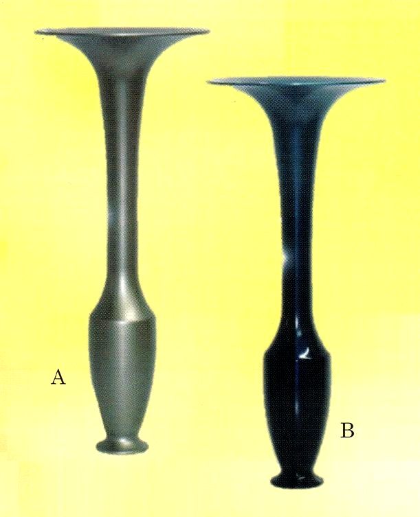 下から上に向かって一直線に伸びてきれいなラインで広がった下かぶら型の銅製花器です。
