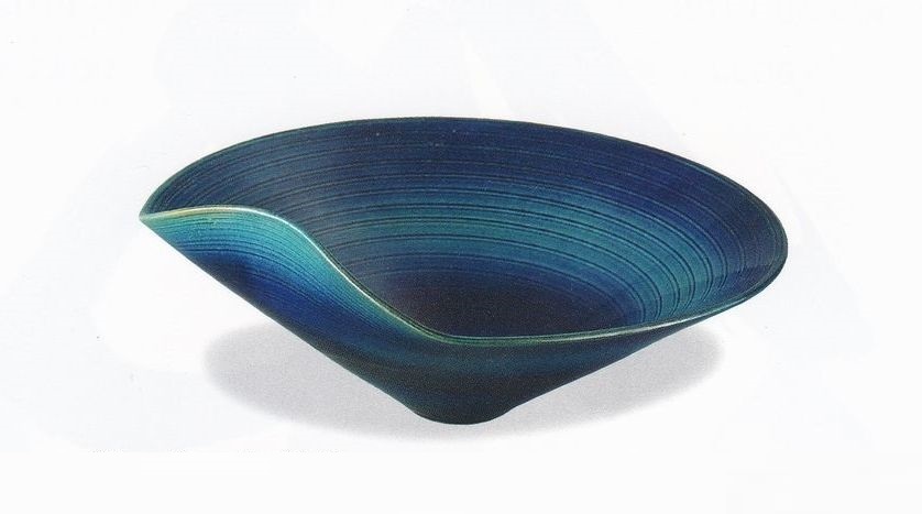ブルーガラス釉の曲げ丸水盤です